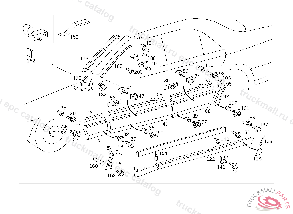 PANELLING LEFT REAR DOOR,PRIMED, FOR COLOR NUMBERS AND PAINT CODES USED FOR OUTSIDE PARTS, SEE FOOTNOTE: 970 TO BE PAINTED PRIOR TO INSTALLATION A 192208 EXCEPT FOR A 159651 - A 192207 WITH CODE 856 UP TO END OF MODELYEAR 94