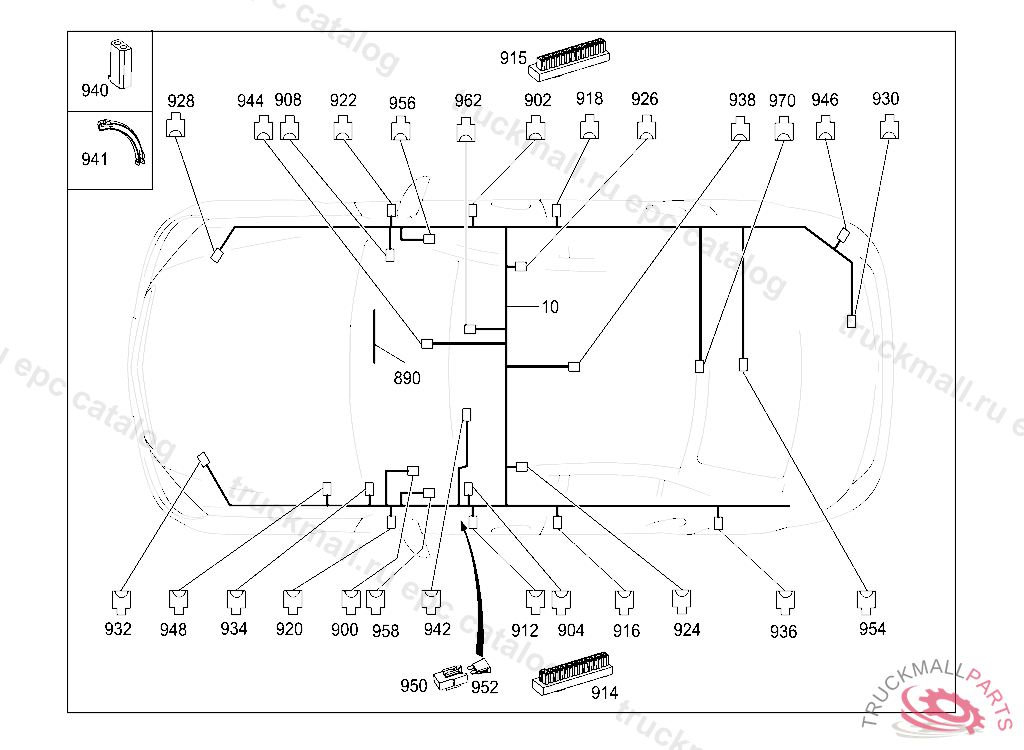 WIRING HARNESS FRAME FLOOR UNIT MAIN CABLE HARNESS, STATE IDENT NO. WHEN ORDERING THE CORRESPONDING SPECIAL EQUIPMENT IS CONTAINED IN THE WIRING HARNESS ACCORDING TO THE VEHICLE PRODUCTION NUMBER