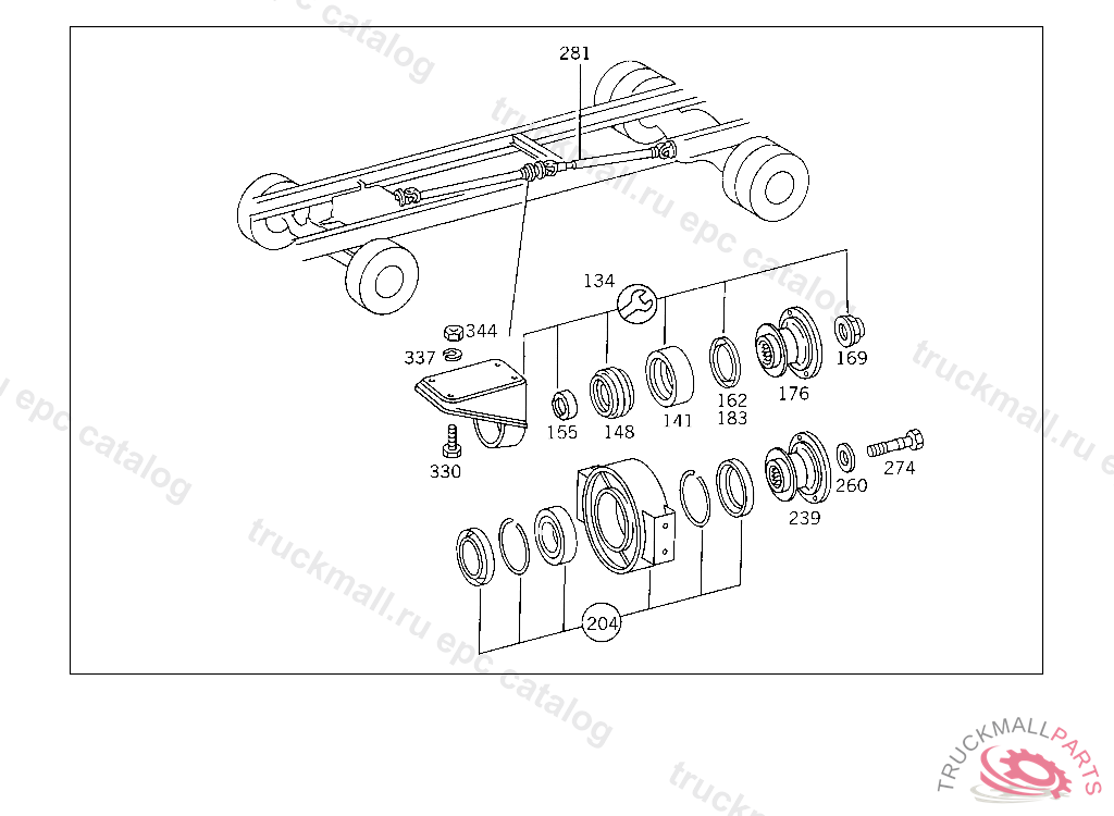 PROTECTIVE CAP FOLLOWER FLANGE, INTERMEDIATE BEARING, BALL BEARING IN RUBBER SEAT