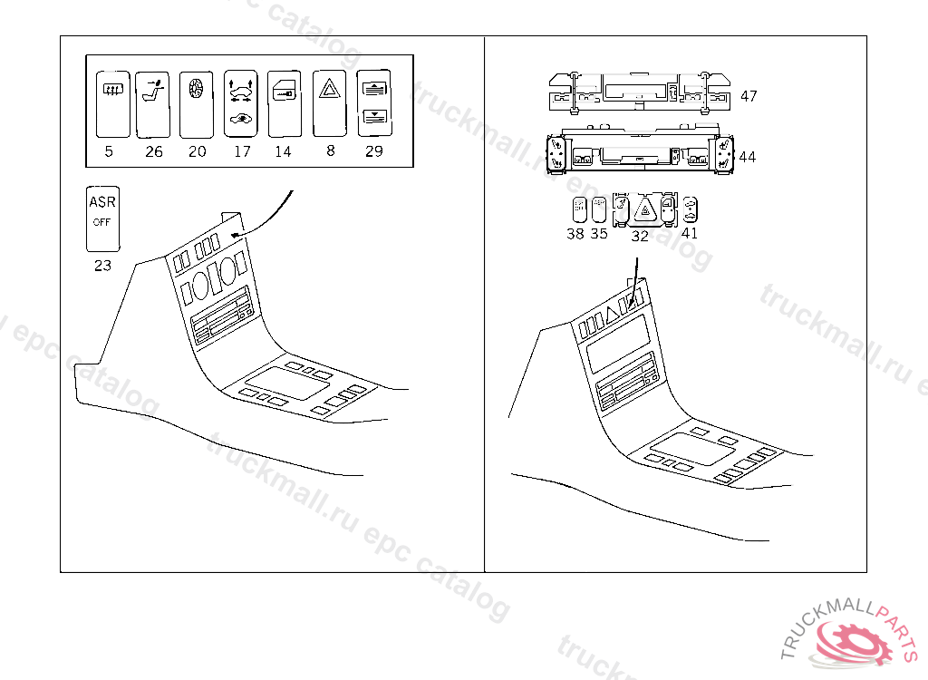 SWITCH HAZ.WARN.FLASH.S.,HD.RESTR.REL.,CENTR. LOCK.S.SWITCH INSIDE VEH., A 344661 F 331441 EXCEPT CODE 805 ALSO INSTALLED IN VEHICLE TO A 344660, F 331440 WITH CODE 806 A 519673 F 619720 EXCEPT CODE 808 ALSO INSTALLED IN VEHICLE FROM A 519674, F 619721 WITH CODE 807