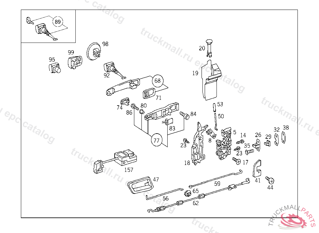 PULL INSIDE DOOR HANDLE TO DOOR LOCK, A 464761 F 519820 A 519673 F 619720 EXCEPT CODE 808 ALSO INSTALLED IN VEHICLE FROM A 519674, F 619721 WITH CODE 807