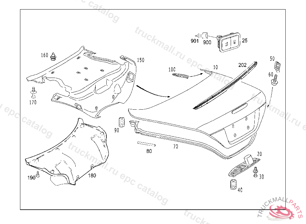 TRUNK LID , UP TO IDENT F063909, WHEN ORDERING TRUNK LID, END STOP1X A2307500126, LEFT/2X A2307500226, RIGHT AND 2X A2307570344 MUST A LSO BE ORDERED.
