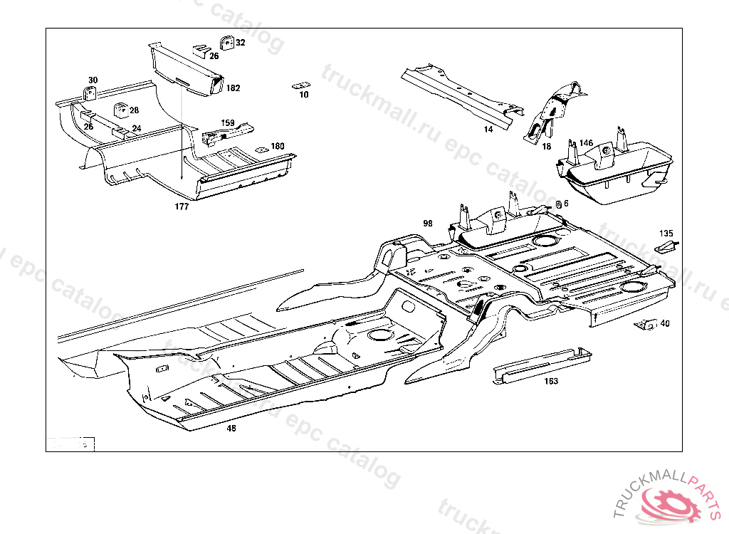 REAR END FLOOR , EXHAUST STOCK OF OLD PART NUMBERS FIRST UP TO CHASSIS: 000,002,010 125671 015 169353 100,102,103,110,112 342132, Replaced By: A1156180561