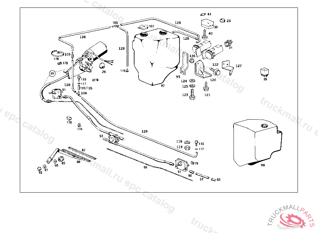 WIPER ASSEMBLY RANGE OF DELIVERY FOR SUBSEQUENT INSTALLATION, ORDER ADDITIONALLY:1 CABLE HARNESS,1 FLUID RESERVOIR,1 PUMP,SEE SA 55872 107.022,042 FROM PRODUCTION START FROM CHASSIS:107.023 009850 107.024 007850 107.043 011508 107.044 021172 ALSO INSTALLED ON: 021165,021170