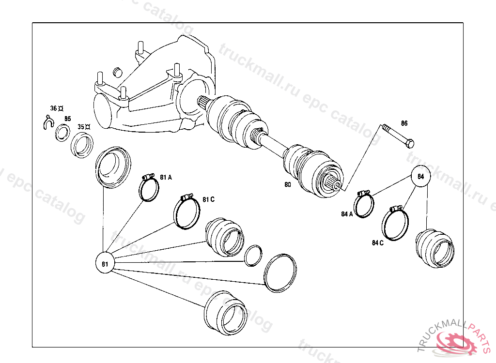 AXLE SHAFT , REAR AXLE HOUSING WITH DIFFERENTIAL AND WITH SIDE BEARING CAPS 003 103238 007 087550 086 007105 093 008991 102,103 240182 105 231728 183 015394 190 021956 193 002092 200 027294 280 000776 283 003631 RIGHT, Replaced By: A1073503310, +001A0149976247