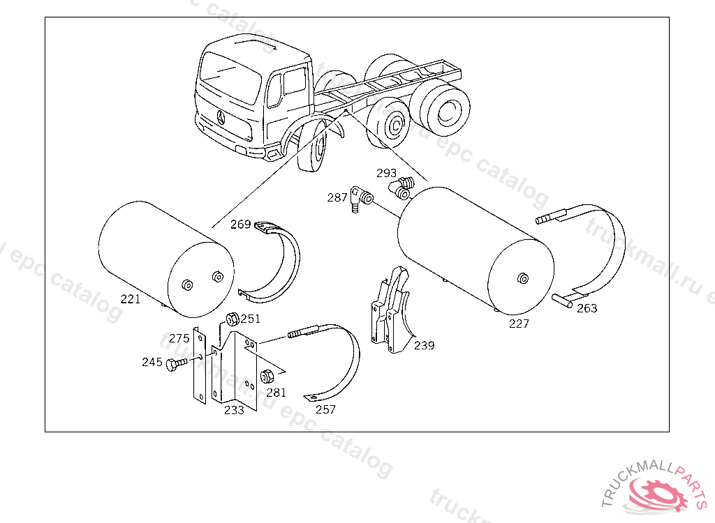 RESERVOIR COMPRESSED AIR 20 L, TO VOSS 232, FOR VEHICLES WITH VOSS 230 CONNECTOR: ADD. MOUNT FITTING "A 004 997 82 72" WITH O-RING "A 000 987 04 46" AND THRUST RING "A 000 997 02 03" TO AIR RESERVOIR