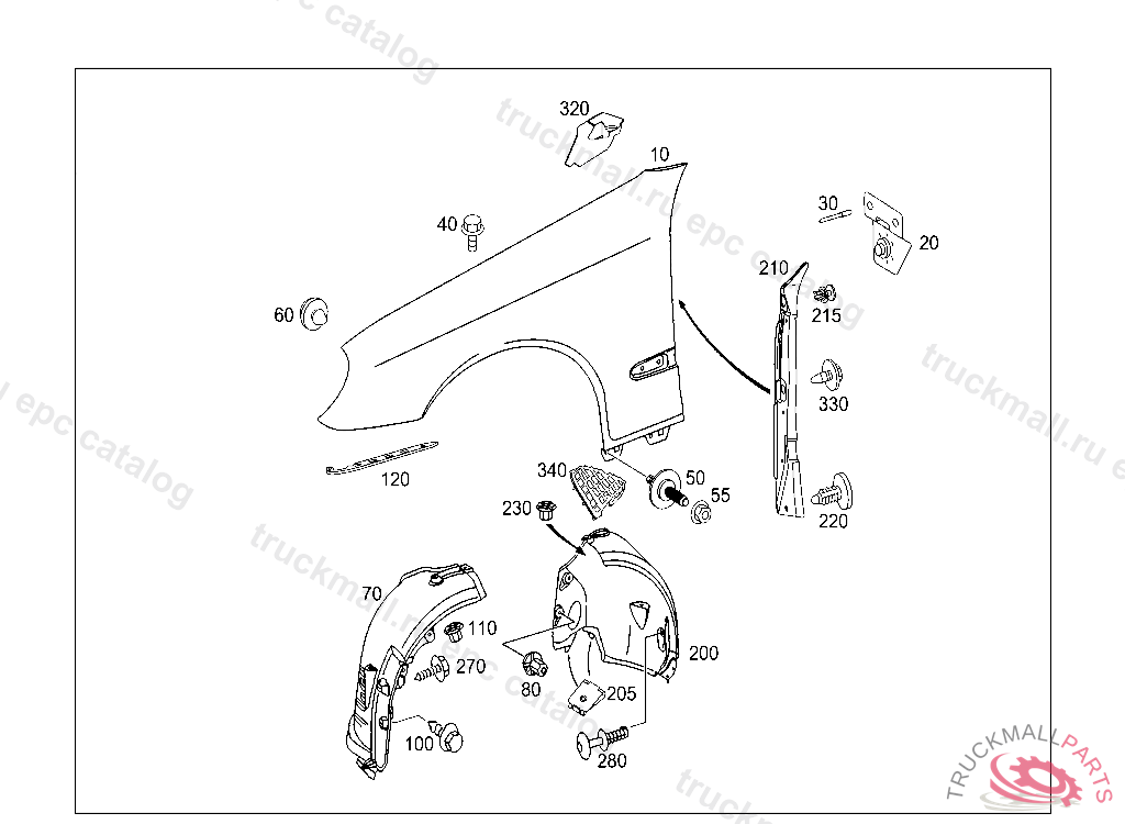 FRONT FENDER RIGHT, A 74667620050113 A 73475220041231 L 00000020041231 X 18076220050118, Replaced By: A2118801418, +001A2116202014, +002A0039903597