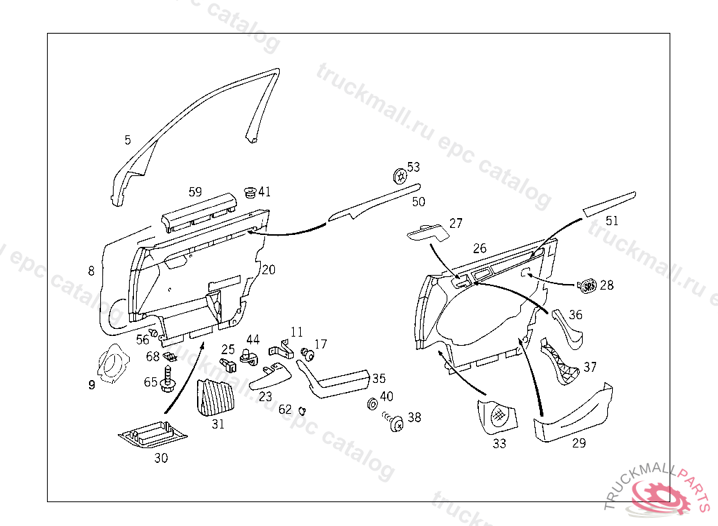 PANELLING RIGHT FRONT DOOR, USED WITH IMITATION LEATHER TRIM, A 519674 F 619721 EXCEPT CODE 807 ALSO INSTALLED IN VEHICLE TO A 519673, F 619720 WITH CODE 808 NO.9B12 INO.5B29 INO.8G01 INO.8G06 I....... INO.7D03 I