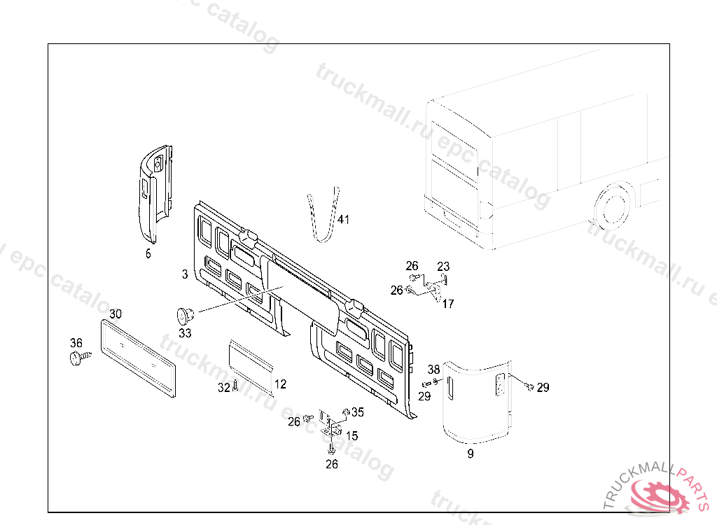 REAR BUMPER FACE BAR CENTRAL, VEHICLE WIDTH 2500 MM, ON VEHICLES HAVING NO MERCEDES BENZ BODY FROM IDENT NO. 095826 FOR USE WITH MERCEDES-BENZ BODY FROM IDENT NO.: 095929