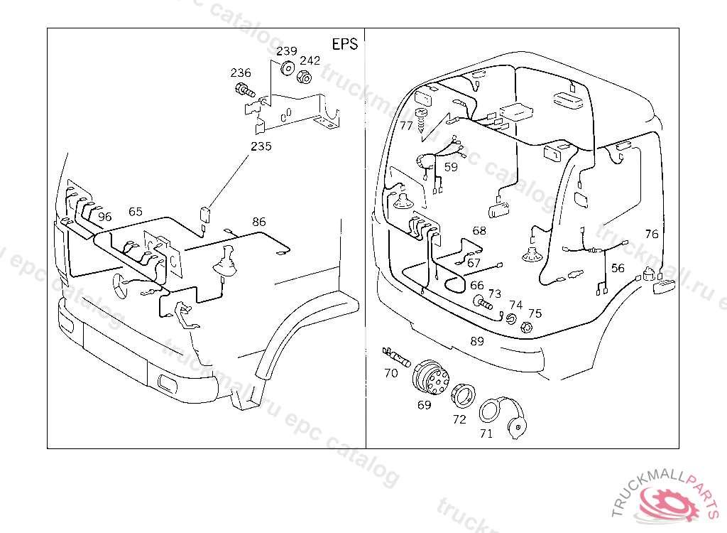 CABLE HARNESS FROM CHASSIS PLUG CONNECTION TO TRANSMISSION PLUG CONNECTION EPS-E, THIS CABLE HARNESS IS A COMPONENT OF FRAME MOUNTED CABLE HARNESS ASSEMBLY AND CAN BE MADE AVAILABLE AS A SPARE ATTENTION: WHEN PLACING ORDERS, PLEASE QUOTE VEHICLE IDENT NO. ONLY IF FRAME MOUNTED CABLE HARNESS IS REQUIRED AS AN ASSEMBLY5 957780K 041928