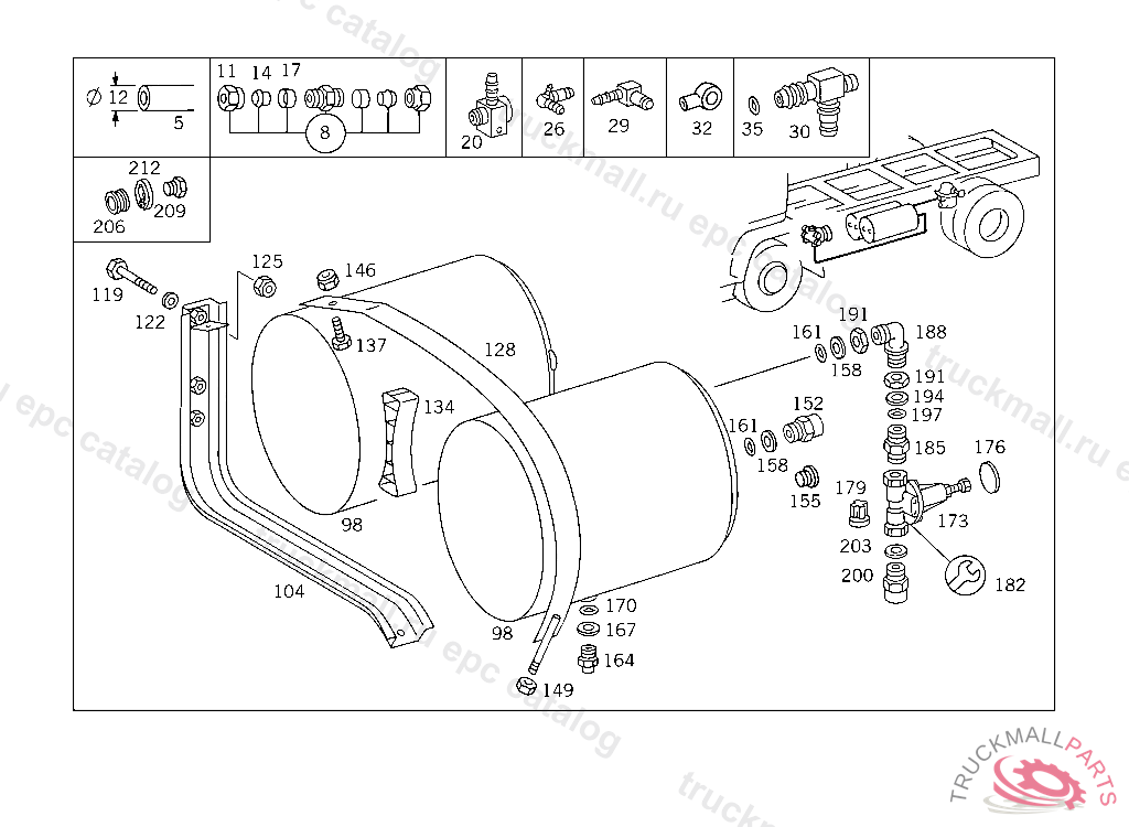 RESERVOIR COMPRESSED AIR 20 L, TO VOSS 232, FOR VEHICLES WITH VOSS 230 CONNECTOR: ADD. MOUNT FITTING "A 004 997 82 72" WITH O-RING "A 000 987 04 46" AND THRUST RING "A 000 997 02 03" TO AIR RESERVOIR