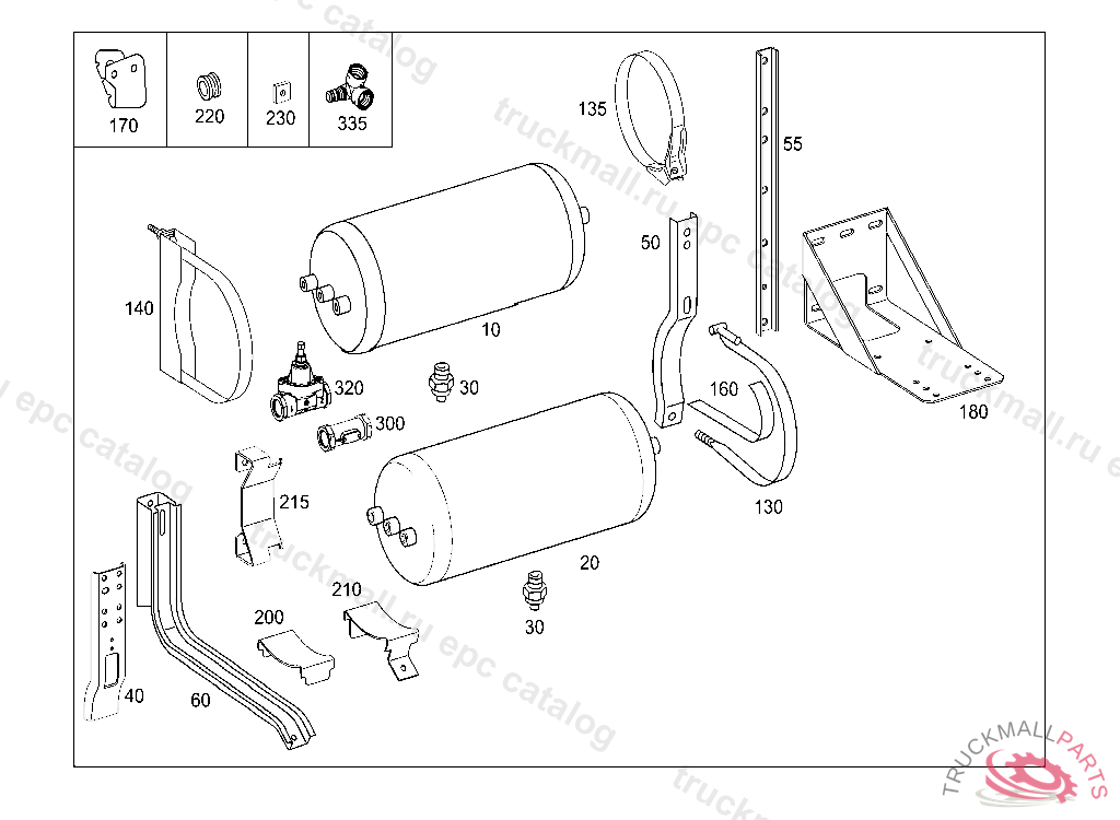 RESERVOIR BRAKE 40 L, TO VOSS 232, FOR VEHICLES WITH VOSS 230 CONNECTOR: ADD. MOUNT FITTING "A 004 997 82 72" WITH O-RING "A 000 987 04 46" AND THRUST RING "A 000 997 02 03" TO AIR RESERVOIR