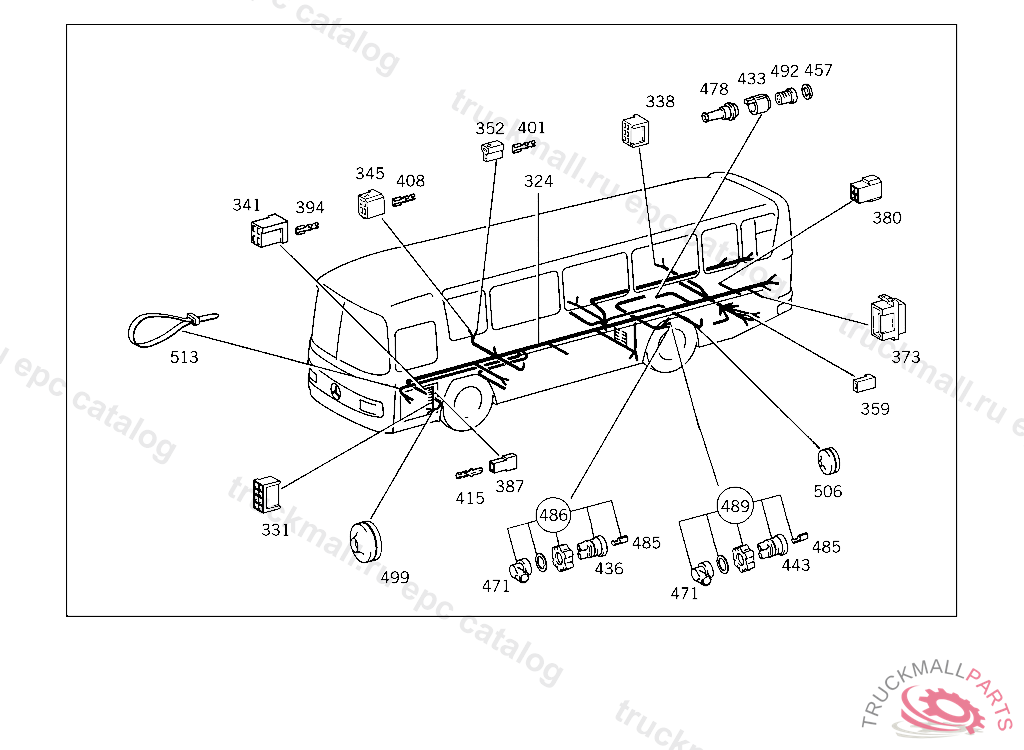 CABLE HARNESS REAR END, USED WITHOUT MERCEDES-BENZ BODY FROM IDENT NO. 038229 ON VEHICLES HAVING MERCEDES BENZ BODY FROM IDENT NO. 038391,ALSO INSTALLED ON 038342,038344,038375.