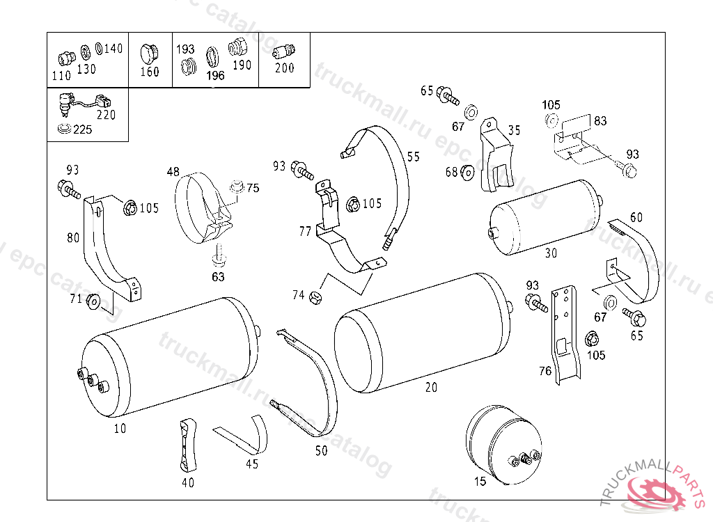 RESERVOIR (AIR RESERVOIR),STEEL VERSION 25L, FOR VEHICLES WITH VOSS 230 CONNECTOR: ADD. MOUNT FITTING "A 004 997 82 72" WITH O-RING "A 000 987 04 46" AND THRUST RING "A 000 997 02 03" TO AIR RESERVOIR