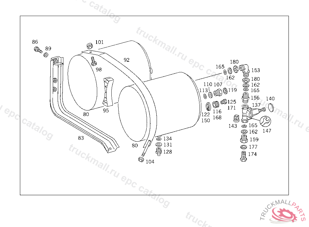 RESERVOIR COMPRESSED AIR 20 L, TO VOSS 232, FOR VEHICLES WITH VOSS 230 CONNECTOR: ADD. MOUNT FITTING "A 004 997 82 72" WITH O-RING "A 000 987 04 46" AND THRUST RING "A 000 997 02 03" TO AIR RESERVOIR