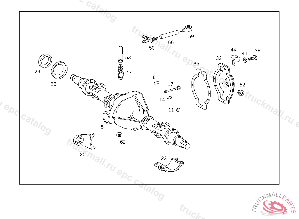 AXLE HOUSING WITH REAR AXLE TUBES AND DIFFERENTIAL CASE BEARING CAPS