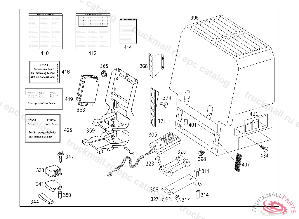INFORMATION LABEL FUSE ARRANGEMENT CHART IN ELECTRICAL COMPARTMENT,V 202043 GERMAN