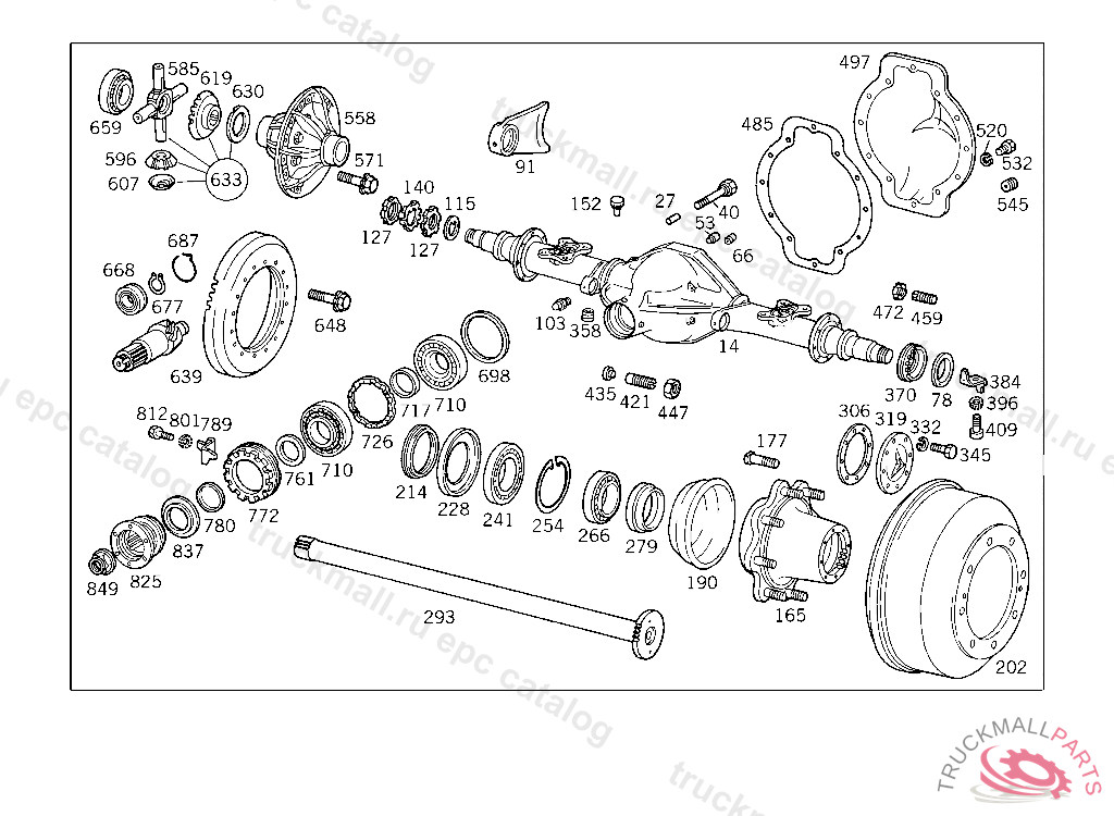 AXLE HOUSING WITH REAR AXLE TUBES AND DIFFERENTIAL CASE BEARING CAPS, FROM REAR AXLE 025961 ONLY ON TYPES LP 1013 1113B L/LP 353 UP TO CHASSIS 983364,LA 353/358 UP TO CHASSIS 985442,L/LP UP TO CHASSIS 984782,ALL 50/60 UP TO CHASSIS 986143
